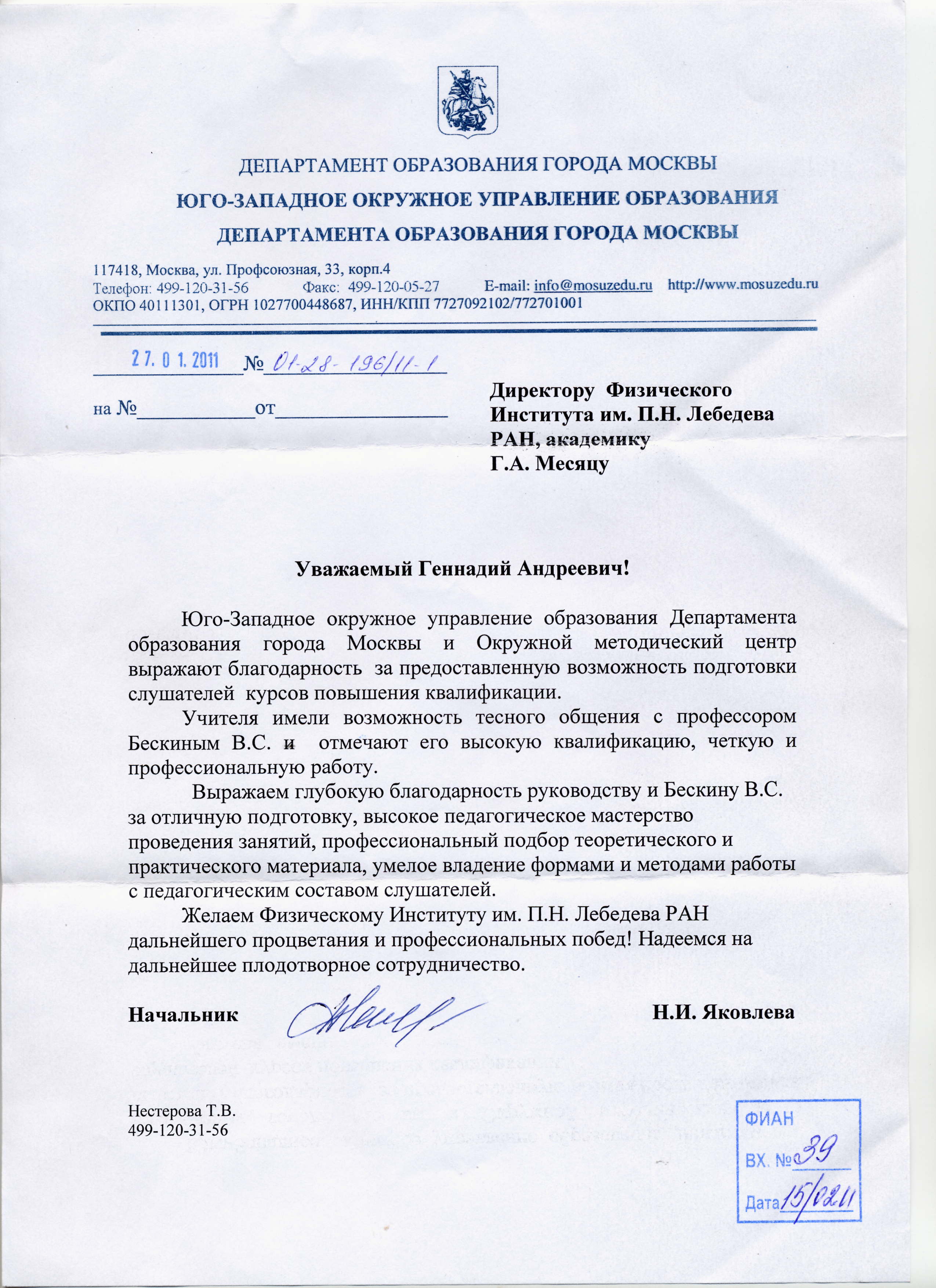 Юго-Западное окружное управление образования Департамента образования города Москвы и Окружной методический центр выражают глубокую благодарность руководству и Бескину B.C. за отличную подготовку, высокое педагогическое мастерство проведения занятий, профессиональный подбор теоретического и практического материала, умелое владение формами и методами работы с педагогическим составом слушателей.