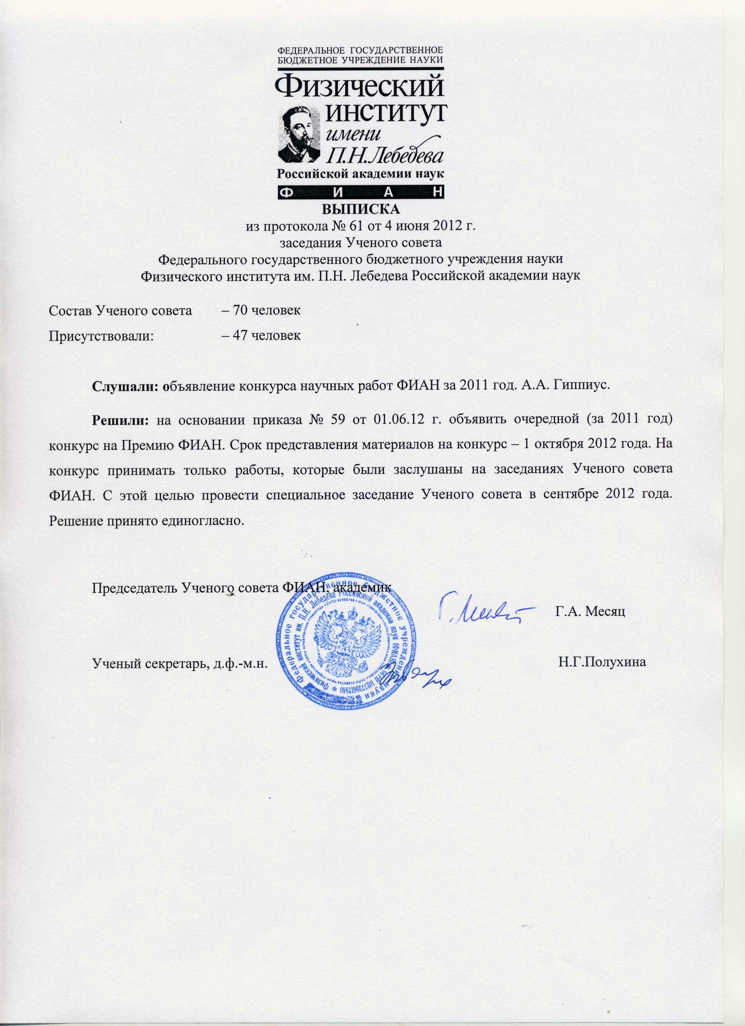 В соответствии с «Положением о ежегодном конкурсе научных работ на Премию Физического института имени П.Н.Лебедева РАН» объявить очередной (за 2011 год) конкурс на Премию ФИАН.