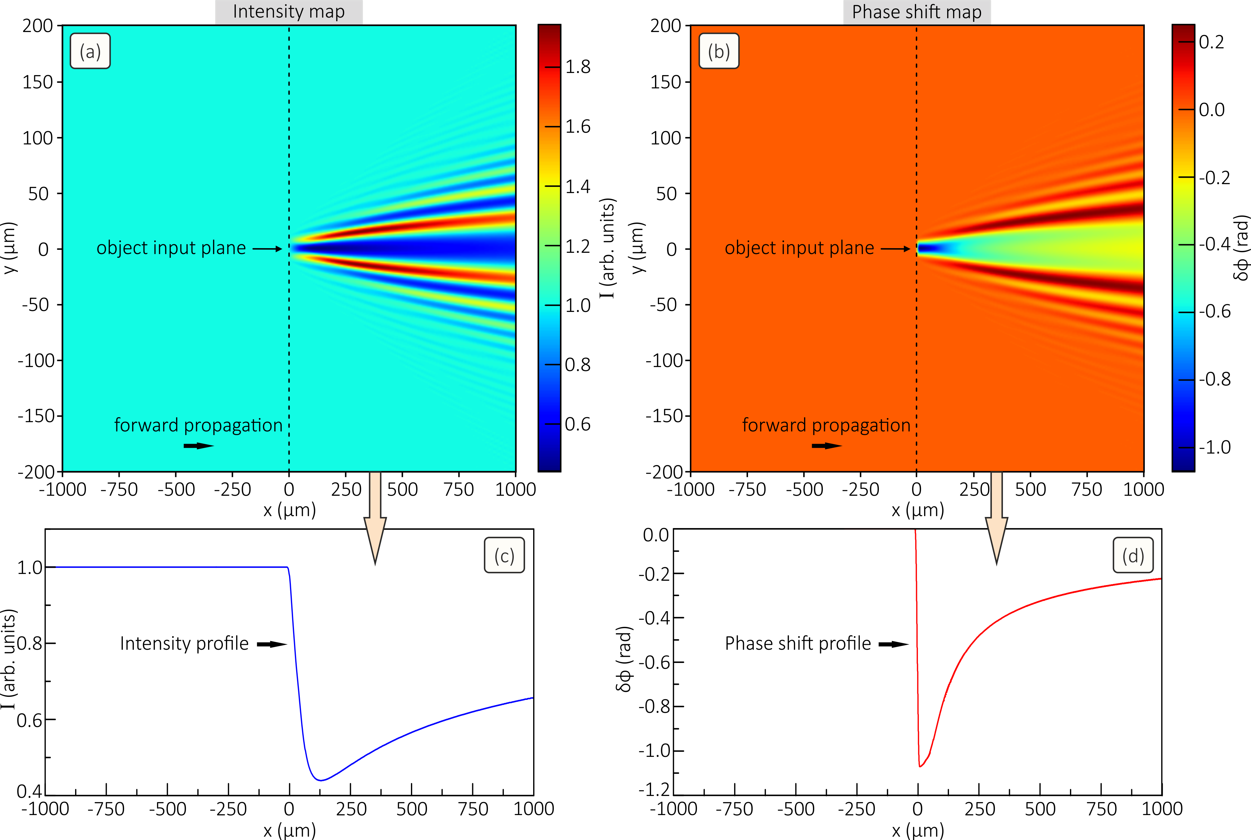 Получены точные решения обратной задачи дифракции, позволяющие наиболее простым путем восстанавливать диэлектрическую проницаемость фазового объекта по изменению интенсивности и фазового сдвига зондирующего его когерентного лазерного излучения. Решения представлены для осесимметричных фазовых объектов, в том числе обладающих поглощением, и учитывают дифракционные эффекты, сопровождающих прохождение излучения сквозь объект и усиливающихся в его ближней волновой зоне. Результаты исследования могут помочь в разработке новых методов лазерной дифракционной фотосъёмки быстро эволюционирующих конденсированных сред.
