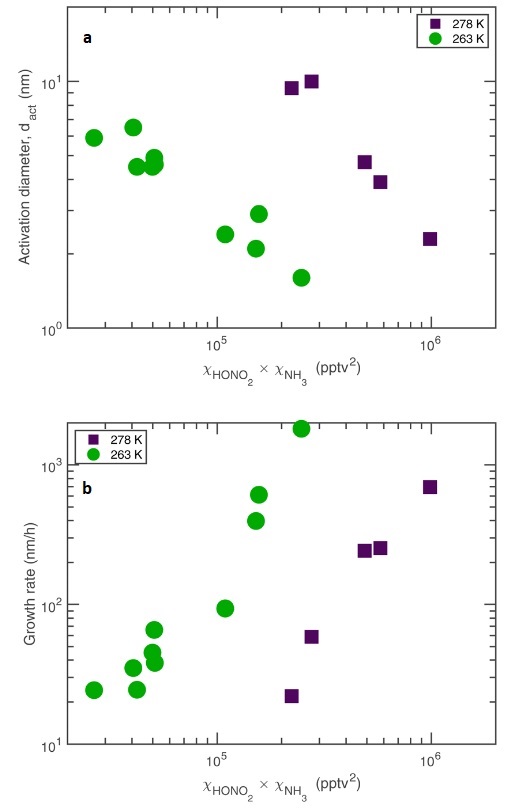 В эксперименте CLOUD (СERN) впервые установлено, что процесс конденсации паров азотной кислоты и аммиака с образованием химически активного нитрата аммония (NH4·NO3) характеризуется наличием критического (активационного) диаметра частиц, который в атмосферных условиях может составлять всего 1 нм. А величина скорости роста частиц аэрозолей при этом может быть чрезвычайно высокой, превышая 1000 нм/час. при температуре больше 263 К.