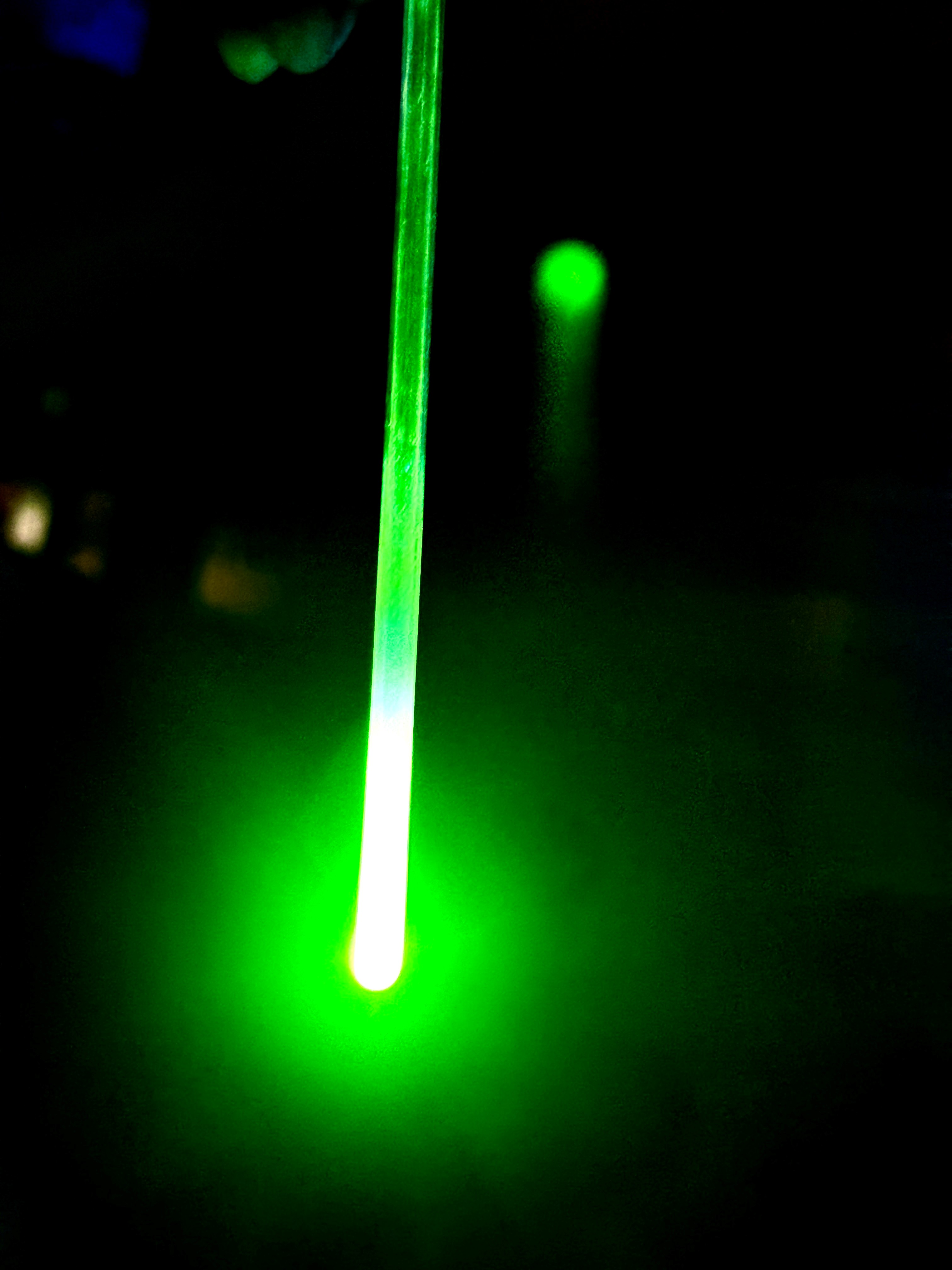 Дифракционная картина люминесценции исследуемого вещества. Видно, как оранжевое свечение самого образца раскладывается на отдельные цветовые компоненты в результате дифракции. Источник: Трофим Поликовский