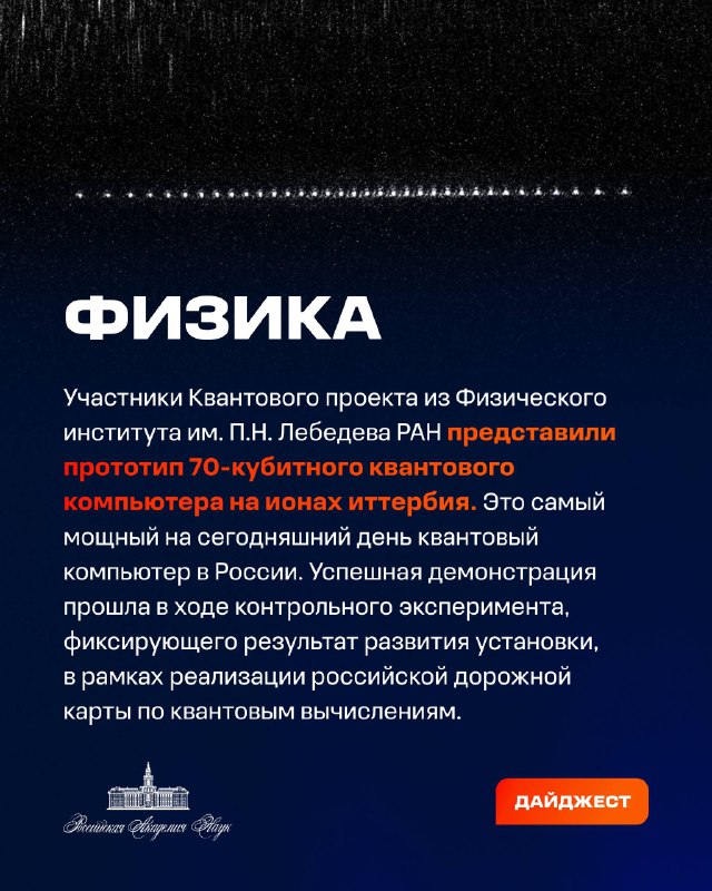 Учёные Физического института имени П. Н. Лебедева РАН (ФИАН) в декабре 2025 года представили прототип самого мощного в России 70-кубитного квантового компьютера. Установка основана на технологии ультрахолодных ионов иттербия и стала ключевым этапом национальной дорожной карты по квантовым вычислениям, сообщили в пресс-службе института.