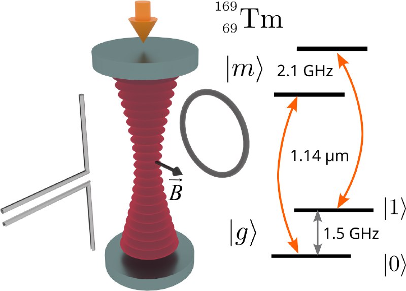 Как пояснили разработчики, тулий — это редкоземельный элемент с богатой энергетической структурой. Преимущества этих атомов, как основы для квантовых вычислений, связаны с возможностью кодировать кубиты в сверхтонких подуровнях основного состояния атома. Это две близких компоненты его энергетической структуры, которые отличаются тем, как ориентированы магнитные моменты ядра и электронов: либо «в одну сторону», либо «в разные». Причем разница в энергии между ними соответствует очень узкому диапазону — микроволновой частоте в 1497 МГц. Воздействуя на этой частоте, можно «переключать» кубит, то есть управлять его квантовым состоянием.