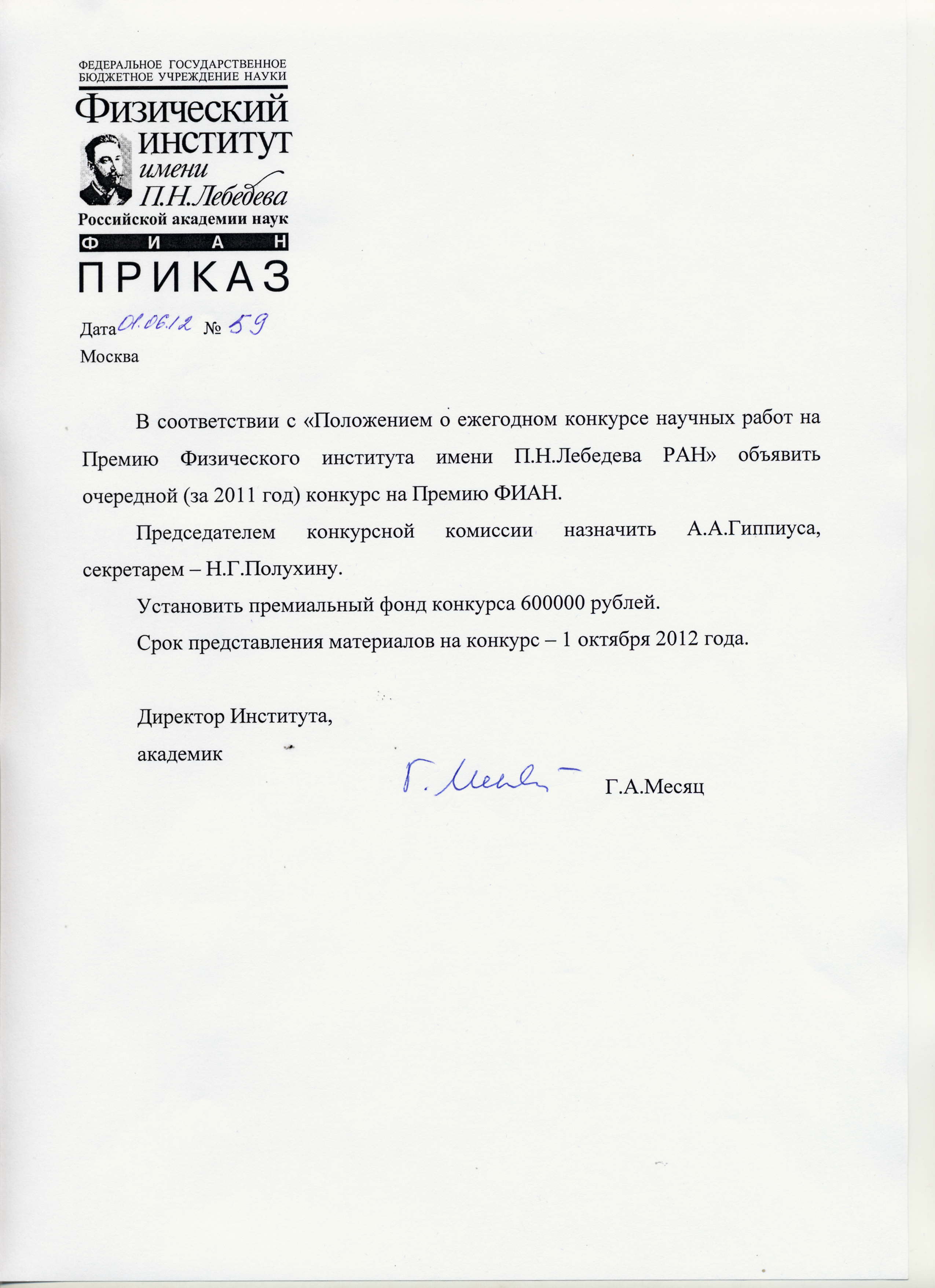 В соответствии с «Положением о ежегодном конкурсе научных работ на Премию Физического института имени П.Н.Лебедева РАН» объявить очередной (за 2011 год) конкурс на Премию ФИАН.