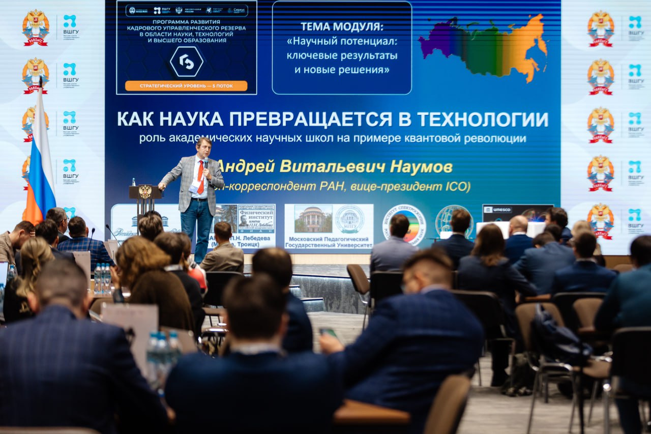 Лекцию на тему «Как наука превращается в технологии: роль академических научных школ на примере квантовой революции» прочитал руководитель ТОП ФИАН член-корреспондент РАН А.В. Наумов.
