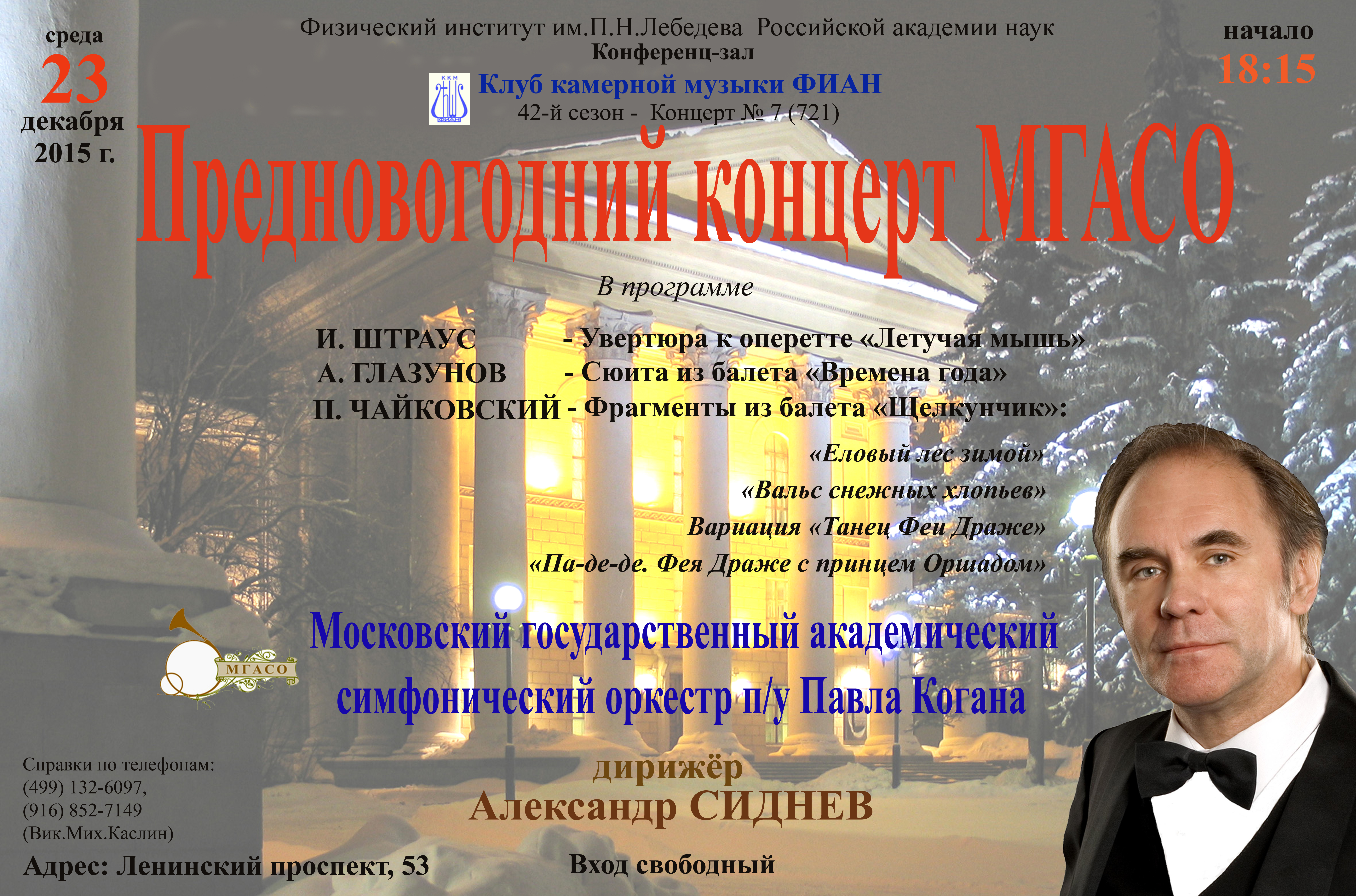 23 декабря в ФИАН предновогодний концерт Московского государственного академического симфонического оркестра Павла КОГАНА