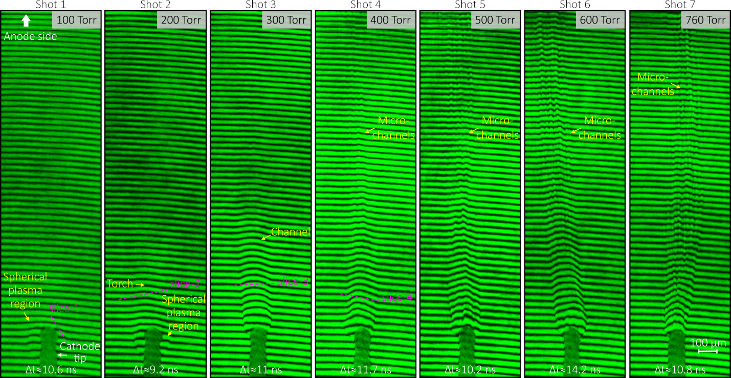 Исследователи из Физического института имени П. Н. Лебедева РАН (Москва) провели серию экспериментов с наносекундным искровым разрядом в воздухе в широком диапазоне давлений — от 100 до 760 Торр (атмосферное давление). Для изучения быстропротекающих процессов с высоким пространственным и временным разрешением использовалась уникальная установка с пикосекундным лазерным зондированием плазмы. Шесть синхронизированных лазерных пучков с длиной волны 532 нм с интервалом в несколько наносекунд регистрировали состояние разряда за один и тот же выстрел, произведенный на установке, что позволило детально отследить динамику формирования плазменных структур. Одновременно записывались интерферограммы, теневые и шлирен-изображения, на основе которых восстанавливались распределения концентрации электронов плазмы с точностью до 2–3 микрометров.