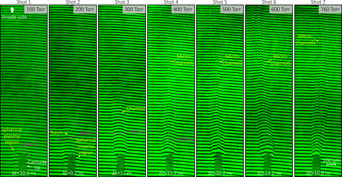 Эксперименты показали, что процесс микроструктуризации — распада фронта ионизационной волны на отдельные микроскопические каналы — имеет пороговый характер по давлению. При атмосферном давлении (760 Торр) и вплоть до 400 Торр наблюдалось образование множества микроскопических каналов диаметром около 20 мкм с концентрацией электронов, близкой к состоянию полной ионизации воздуха. Однако при снижении давления до 300 Торр микроструктура перестала наблюдаться: разряд развивался в виде относительно однородного плазменного канала без мелкомасштабных нитей.
