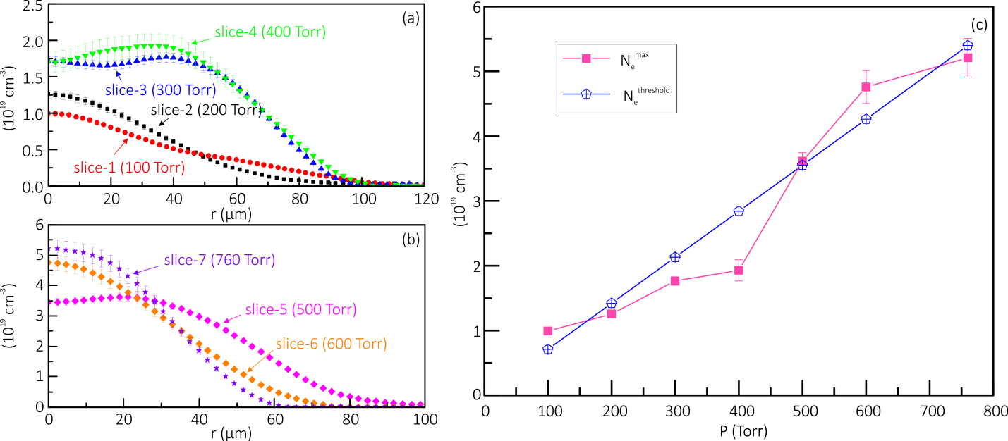 Распределения концентрации электронов в сечениях искрового канала (a,b) и зависимость максимальной концентрации Nemax от давления воздуха (c). Кривая Nethreshold показывает теоретический предел при полной диссоциации и однократной ионизации воздуха.