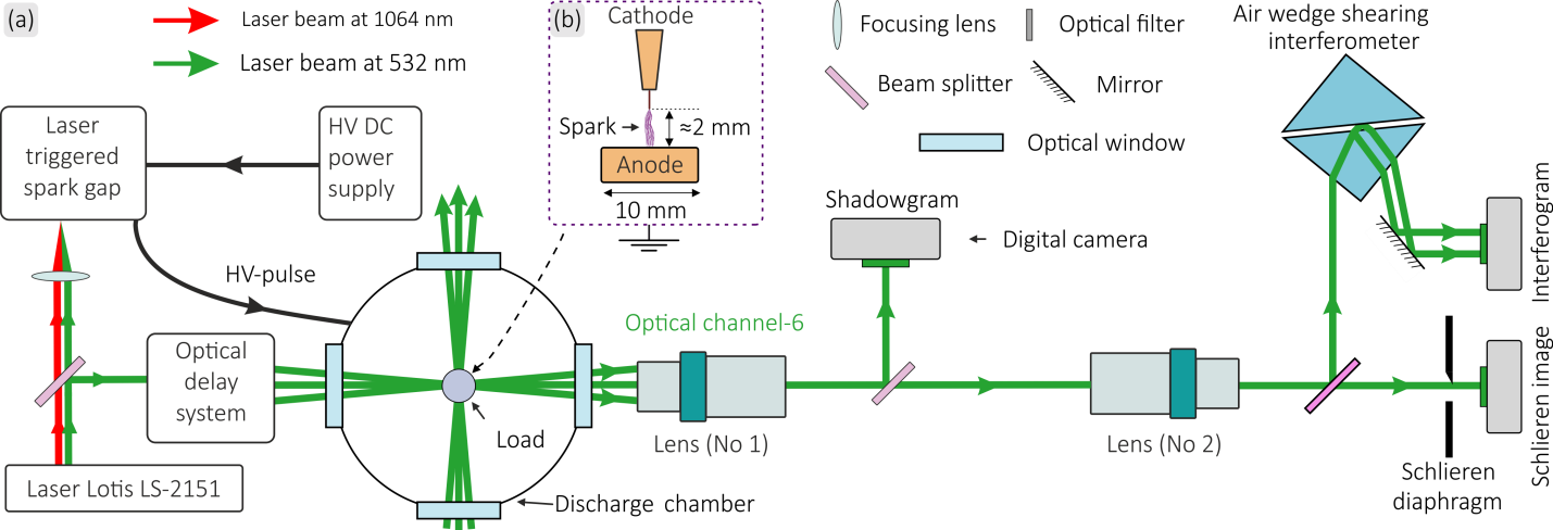 Исследователи из Физического института имени П.Н. Лебедева РАН (Москва) с коллегами из МФТИ и НИИЯФ МГУ имени М.В. Ломоносова (ред. - Пресс-служба РНФ)провели серию экспериментов с наносекундным искровым разрядом в воздухе в широком диапазоне давлений — от 100 до 760 Торр (атмосферное давление). Для изучения быстропротекающих процессов с высоким пространственным и временным разрешением использовалась уникальная установка с пикосекундным лазерным зондированием плазмы. Шесть синхронизированных лазерных пучков с длиной волны 532 нм с интервалом в несколько наносекунд регистрировали состояние разряда за один и тот же выстрел, произведенный на установке, что позволило детально отследить динамику формирования плазменных структур. Одновременно записывались интерферограммы, теневые и шлирен-изображения, на основе которых восстанавливались распределения концентрации электронов плазмы с точностью до 2–3 микрометров.
