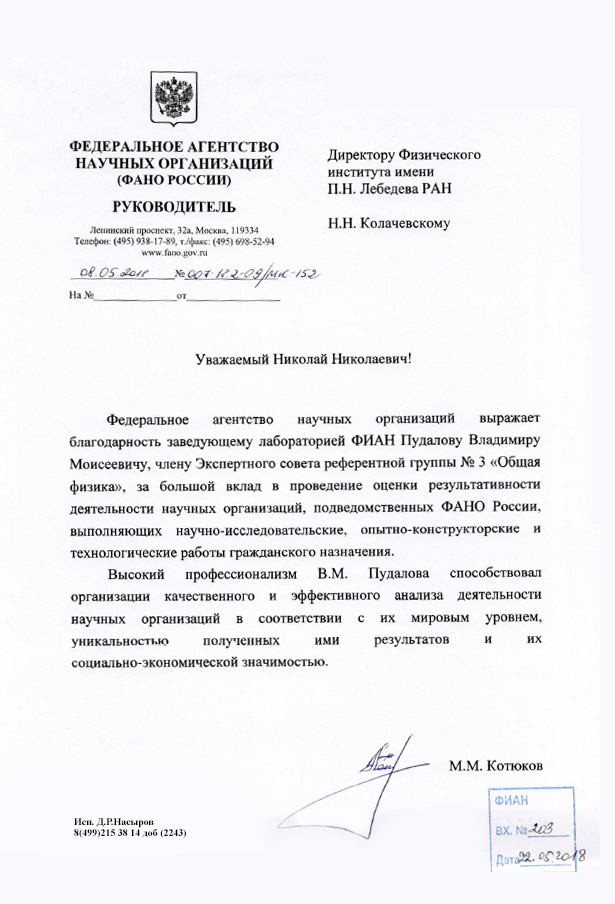 Федеральное агентство научных организаций выражает благодарность главному научному сотруднику ФИАН Михаилу Владимировичу Данилову, заведующему лабораторией ФИАН Пудалову Владимиру Моисеевичу, ведущему научному сотруднику ФИАН Пушкареву Александру Борисовичу, за большой вклад в проведение оценки результативности деятельности научных организаций, подведомственных ФАНО России, выполняющих научно- исследовательские, опытно-конструкторские и технологические работы гражданского назначения