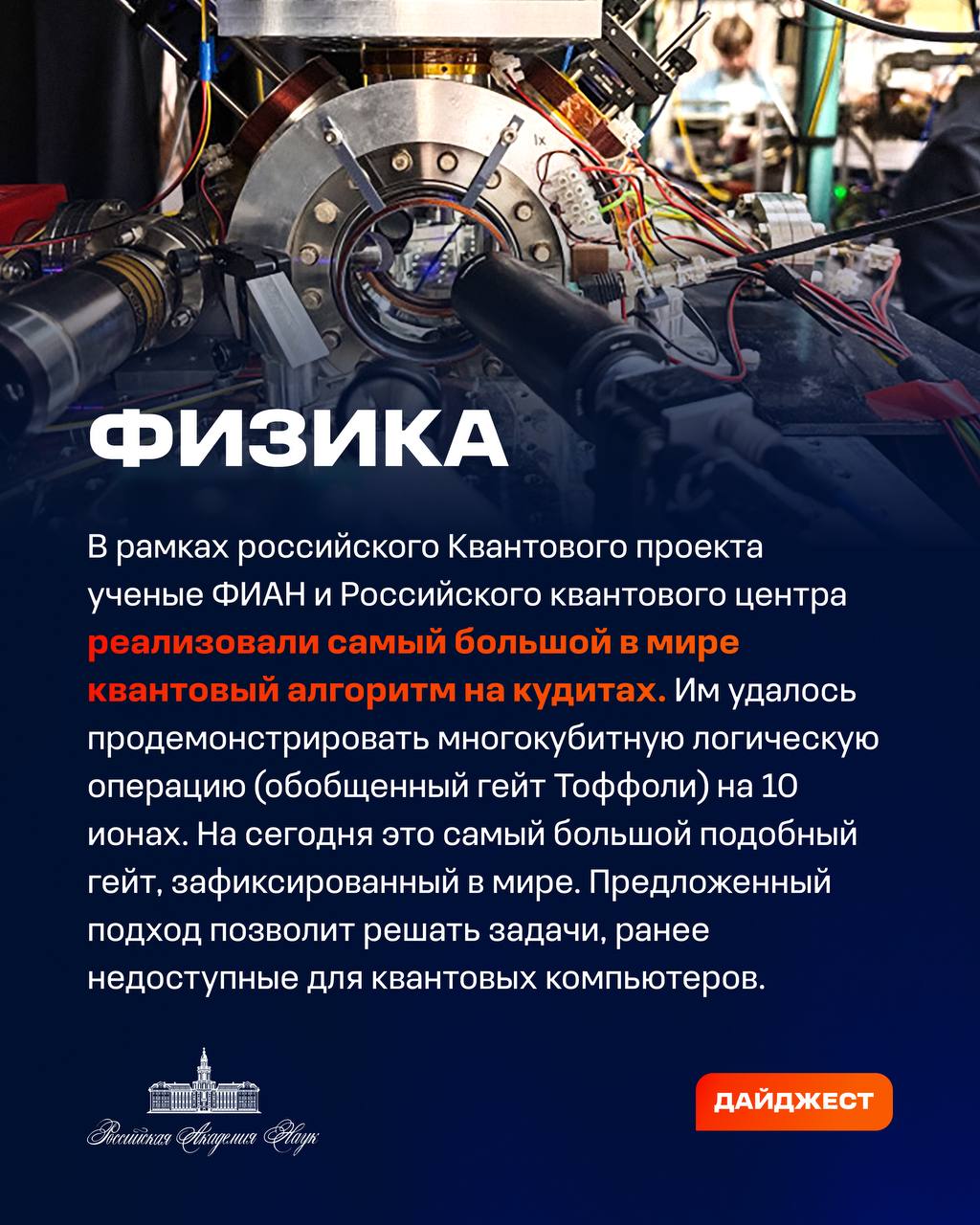 Участники Квантового проекта продемонстрировали многокубитную логическую операцию на 10 ионах. На сегодня это самый большой в мире квантовый алгоритм на кудитах, отметили учёные.